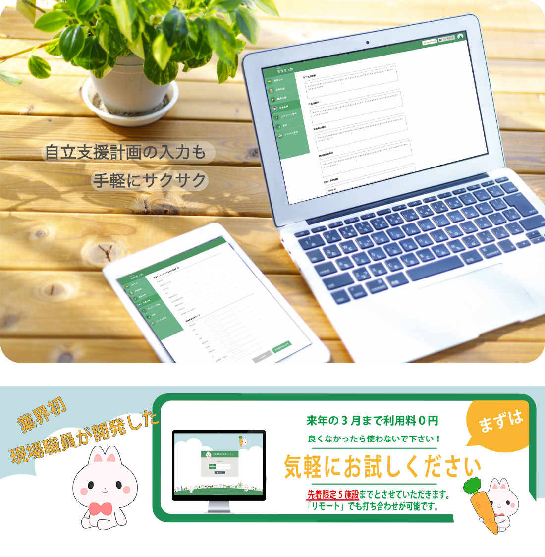 「機能性は良さそうだけれどもシステムが複雑すぎて動作も遅い」と感じた経験はありませんか。私が勤めさせていただいた施設でも機能性は良さそうだったのですが、使い勝手が非常に悪く時間ばっかり取られていました。実際に開発に携わり感じたのですが、現場を知らないと良いシステムを作るのは難しいと考えます。記録入力と聞くと勤務後に打たないといけないな、ちょっと面倒だなと正直思ってしまうことがあると思います。私たちがご提案するシステムは、職員のことを考え丁寧に開発をしました。